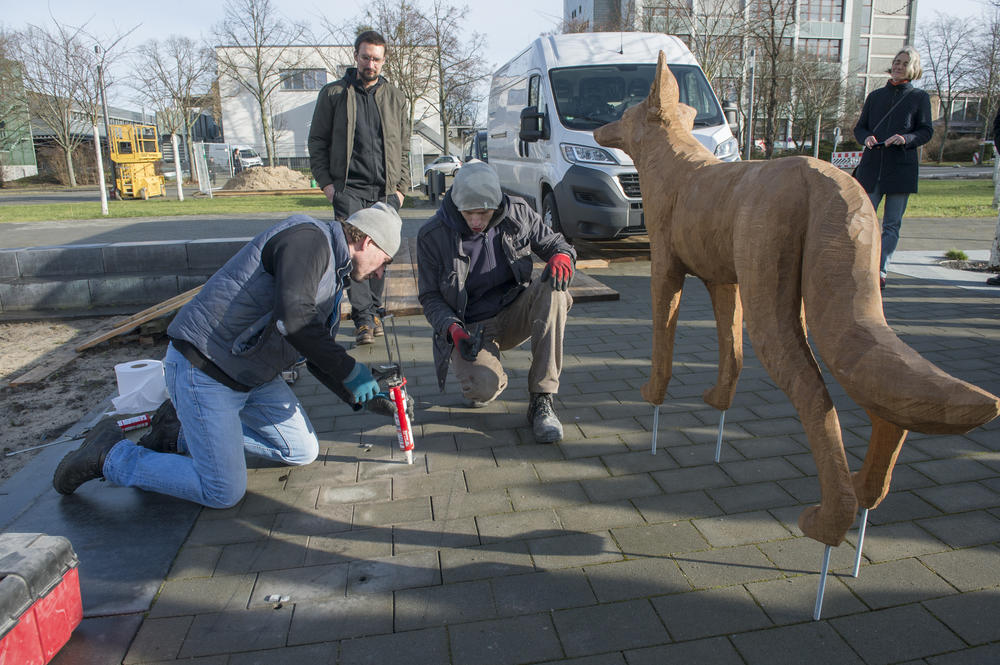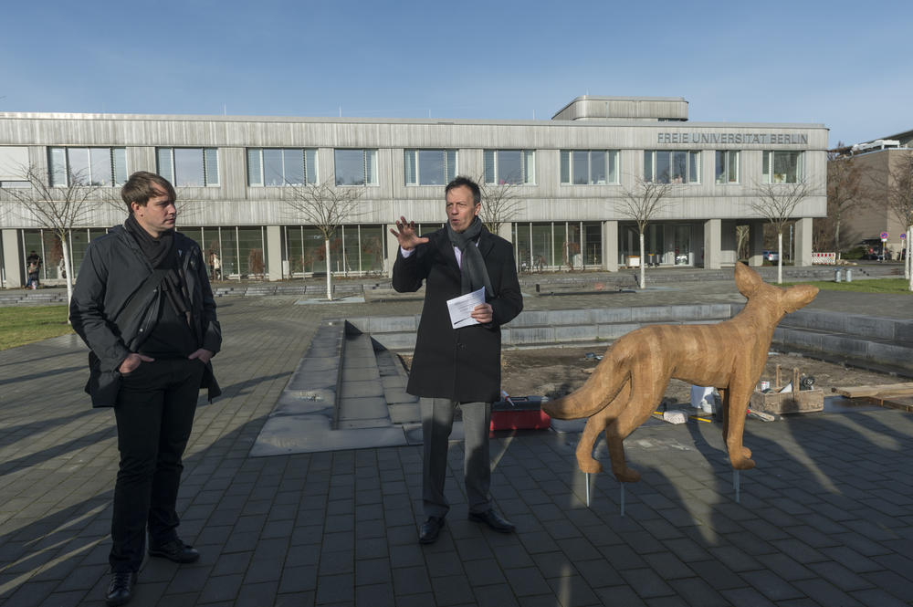 Gerade mal acht Monate hatte der Holz-Kojote auf dem Vorplatz der Holzlaube der Freien Universität gestanden, als er Anfang September verschwand. Am 24. Januar war die gut 100 Kilogramm schwere Eichenholzfigur in Anwesenheit des Künstlers Robert Patz installiert worden. Patz hatte 2016 den von der Freien Universität ausgeschriebenen berlinweiten Wettbewerb „Kunst am Bau“ mit seinem Entwurf „Tricksters Plan“ gewonnen. Das dreiteilige Werk besteht aus der Figur des Holz-Kojoten auf dem Vorplatz der Holzlaube, sechs Installationen in den Treppenhäusern des Gebäudes sowie einer Wandarbeit in der Campusbibliothek. Architektin Iren Böhme, die in der Technischen Abteilung der Freien Universität für das Kunst-am-Bau-Projekt zuständig ist, über das Verschwinden von Trickster und Pläne des Wiederaufbaus.
