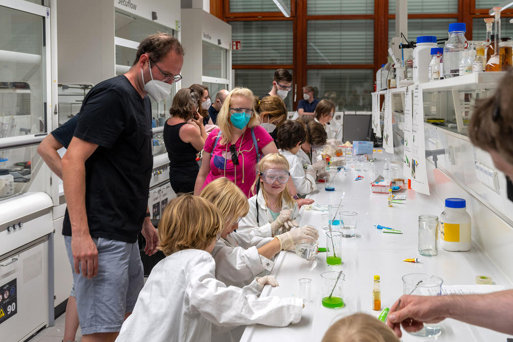 Das Chemie-Gebäude in der Fabeckstraße 34/36 ist seit jeher ein Magnet in der Langen Nacht der Wissenschaften, denn – völlig klar! – dort blitzt, knallt, brennt und leuchtet es. Im NatLab, dem Mitmachlabor für Schülerinnen und Schüler, herrscht großer Andrang, im Gang warten noch viele Kinder geduldig darauf, sich mit Kittel und Schutzbrille in die Welt der Wissenschaft zu begeben.