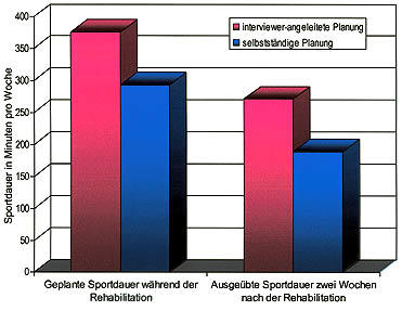 In Bezug auf die Planung von körperlicher Aktivität sind altersgerechte Interventionen möglich, indem man gezielt die Überwindung von altersspezifischen Barrieren bei der Bewältigungsplanung anspricht (zum Beispiel „Wenn ich mich alt und gebrechlich fühle, dann trainiere ich mit einem Partner, der mir hilft“). Dieses Interventionsprinzip wird bereits in Kooperationen des Arbeitsbereiches Gesundheitspsychologie mit Rehabilitationseinrichtungen, wie dem Zentrum für ambulante Rehabilitation in Berlin Mitte, erfolgreich angewandt. In detaillierten Handlungsplänen wird spezifiziert, welche Aktivität wann, wie und wo durchgeführt wird. Durch individuelle Bewältigungsplanung wird festgelegt, wie man trotz bestimmter Hindernisse körperlich aktiv sein kann. Je nach Altersgruppe können hier unterschiedlichste Hindernisse auftreten: Berufstätige fühlen sich beispielsweise nach der Arbeit zu müde, um aktiv zu werden. Bei älteren Erwachsenen sind eventuell im Wohnumfeld nicht genügend altersgerechte Sportmöglichkeiten vorhanden oder sie fühlen sich zu schwach, um Sport zu treiben. Durch angeleitetes Planen kann auf solche Hindernisse gezielt eingegangen werden und Lösungsmöglichkeiten können gefunden werden, damit die körperliche Aktivität dennoch ausgeübt werden kann. Insbesondere zeigt sich in unseren Forschungsergebnissen, dass ein durch Interviewer gestütztes Planen dazu beiträgt, dass bereits in der Rehabilitation eine längere Dauer von körperlichen Aktivitäten geplant wird. Zwei Wochen nach der Rehabilitation zeigte sich dann, dass die Gruppe, die von einem Interviewer unterstützt wurde, auch tatsächlich in einem größeren Ausmaß körperlich aktiv war als die Gruppe, die ihre Aktivitäten alleine geplant hatte (siehe Abbildung 3).