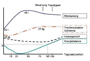 Aus diesem Grund macht jede Milchkuh nach der Geburt des Kalbes eine Periode der negativen Energiebilanz mit (Abbildung oben), in der sie den bestehenden Bedarf aus eigenen Körperreserven (Körperfett, Muskeleiweiß) decken muss. Vor allem diejenigen Kühe, die in der Trockenstehperiode durch übermäßige Fütterung übergewichtig geworden sind, haben Anpassungsschwierigkeiten und sind für Krankheiten anfälliger.