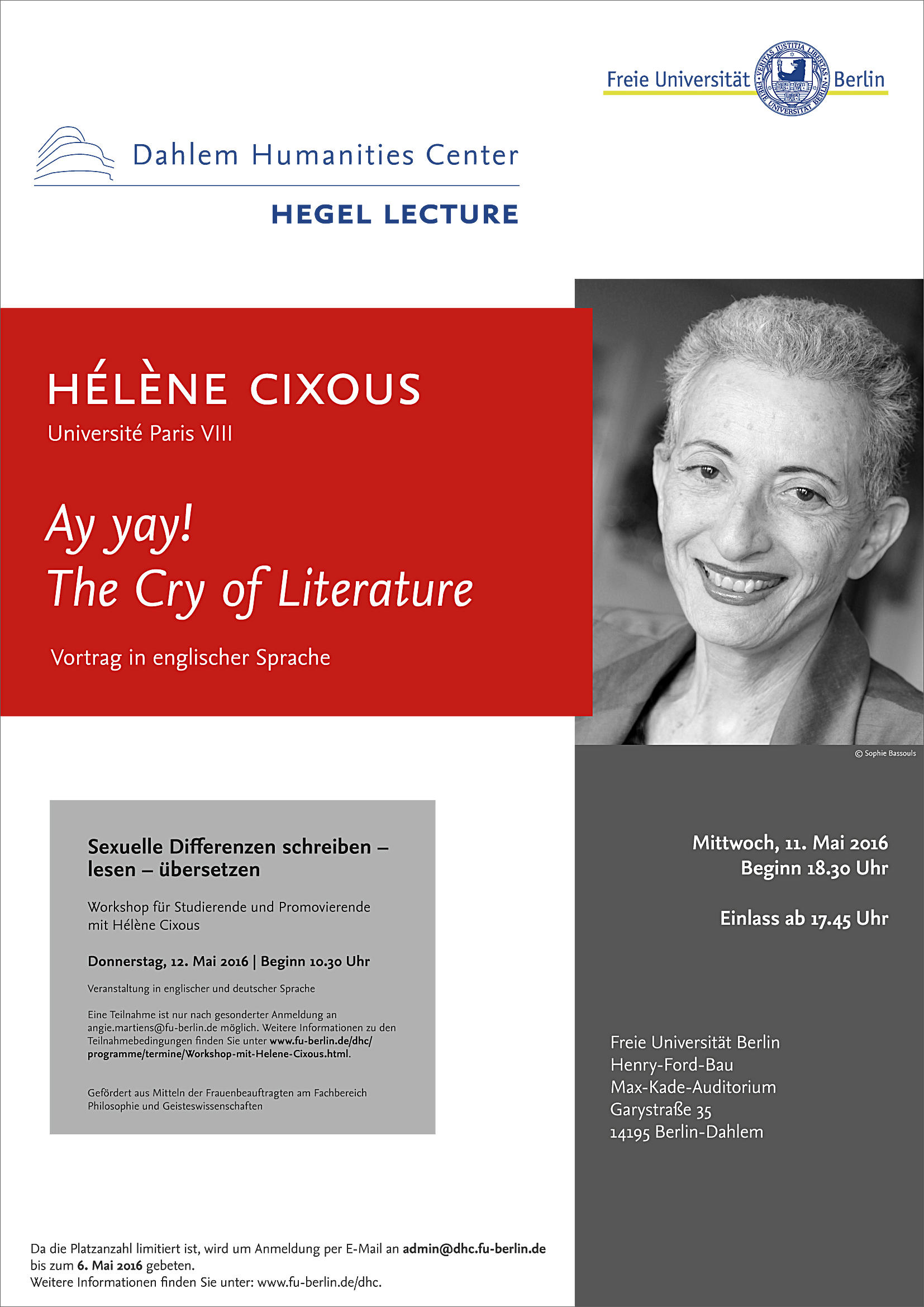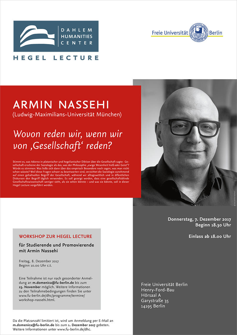 Einer der Höhepunkte im akademischen Kalender der Freien Universität Berlin ist die jährlich stattfindende Hegel Lecture, die von weltweit herausragenden Geisteswissenschaftler:innen und Personen des kulturellen Lebens gehalten wird und sich an die universitäre und die allgemeine Öffentlichkeit richtet. Die Vorlesung ist von ihren Zielen her insbesondere dem in Hegels Philosophie zentral auftretenden Begriff der Freiheit verpflichtet, einem Wert, dem auch die Universität, an der das DHC angesiedelt ist, Namen und Existenz verdankt.