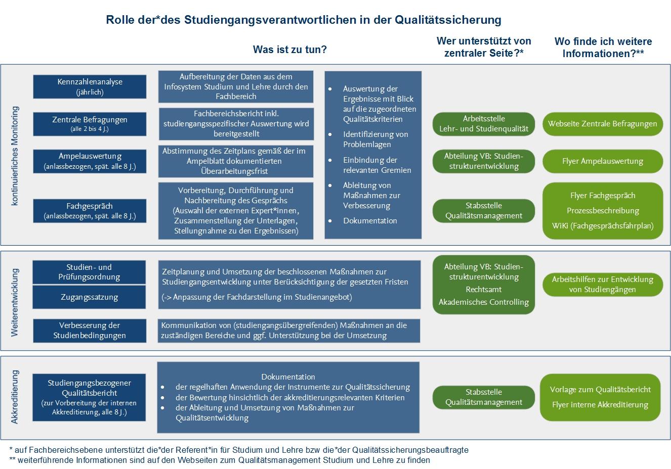 Eine Hilfestellung zu den verschiedenen Aspekten der Qualitätssicherung auf Studiengangsebene finden Studiengangsverantwortliche bei Interesse hier: Rolle der*des Studiengangsverantwortlichen in der Qualitätssicherung