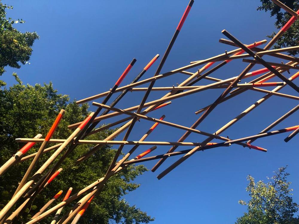 Die Rauminstallation setzt sich aus 53 neuen und alten Besenstielen zusammen. Diese schafft einen räumlichen Dialog zwischen dem etwas versteckten Garten, unserer Universität, dem Kino und der Nachbarschaft. Die Besen wurden spalierartig zusammengesetzt und in den Himmel gehoben. Im Zusammenspiel der unterschiedlichen Besenstiellängen, der krummen und geraden Formen, der Holztexturen und Farbe entsteht eine rhythmische Bewegung. Diese lädt ein, neugierig einzutreten und den Garten in all seiner wilden Vielfalt zu entdecken.