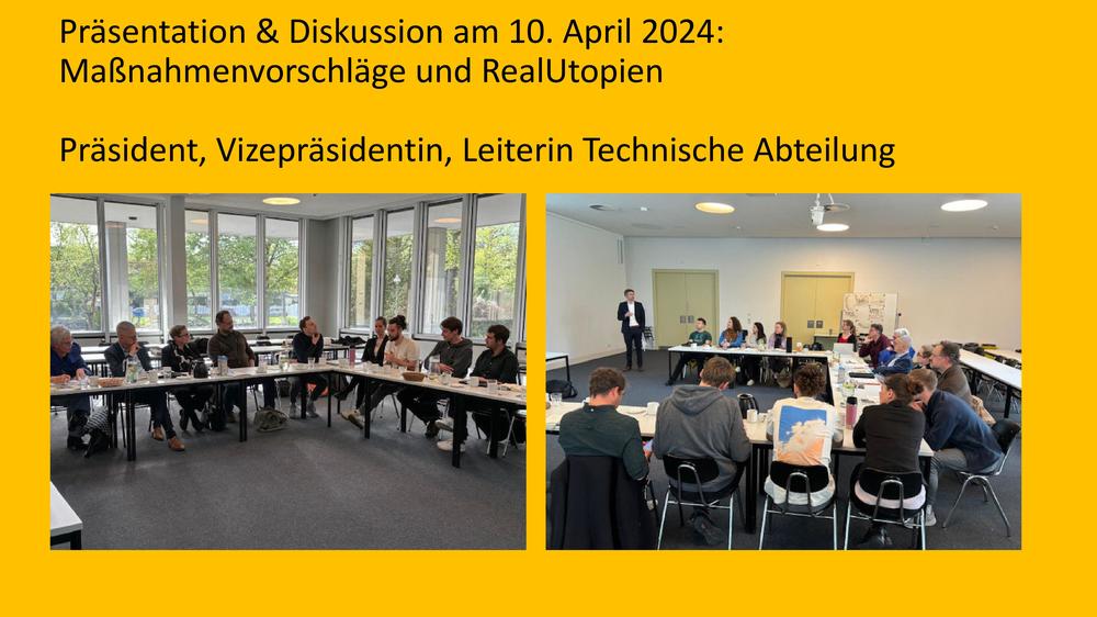 Im April 2024 haben wir unserer Arbeitsergebnisse, die Maßnahmenvorschläge, die beiden Gestaltungspläne der Peter-Lenné-Schule und erste Kostenschätzungen dem Präsidenten der Freien Universität, Prof. Dr. Ziegler, der ersten Vizepräsidentin Prof. Dr. Verena Blechinger-Talcott und der Leiterin der Technischen Abteilung, Ursula Hüffer vorgestellt. Gemeinsam mit den Schüler:innen, Studierednen und dem FUturist-Team haben wir zwei Stunden über die Mach- und Umsetzbarkeit unserer Vorschläge diskutiert.