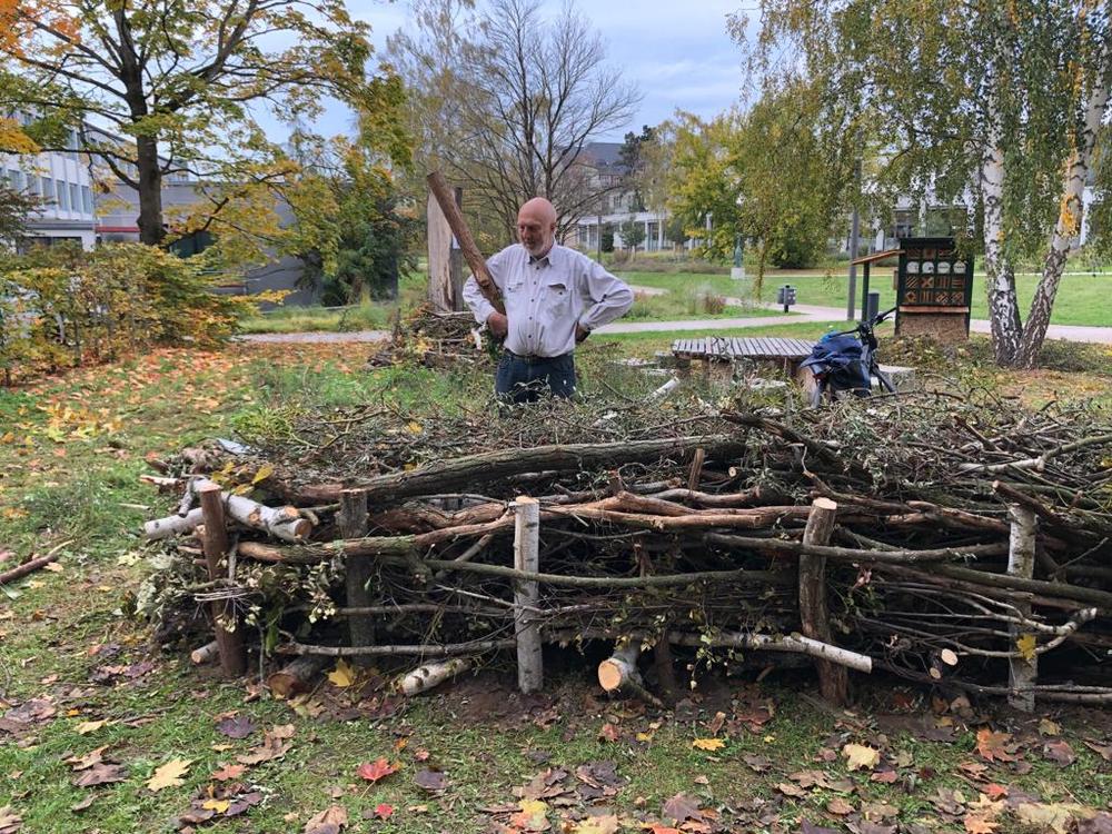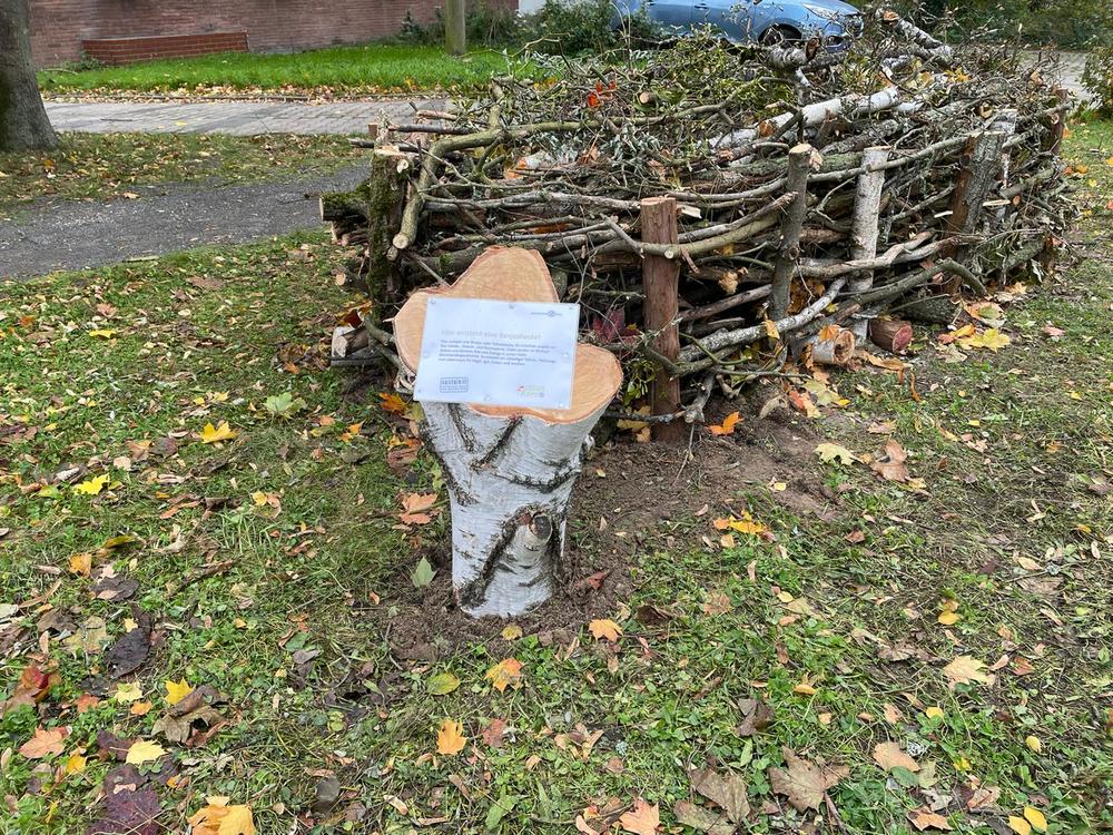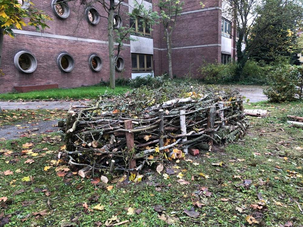 Als Initiative haben wir eine ellipsenförmige Benjes- oder Totholzhecke angelegt. Dafür haben wir Gehölz-, Strauch- und Baumschnitt übereinandergestapelt. Dabei wurden im Wechsel dickere und dünnere Äste und Zweige in Linien locker übereinandergeschichtet. So entsteht ein vielseitiger Schutz-, Nahrungs- und Lebensraum für Vögel, Igel, Kröten und Insekten!