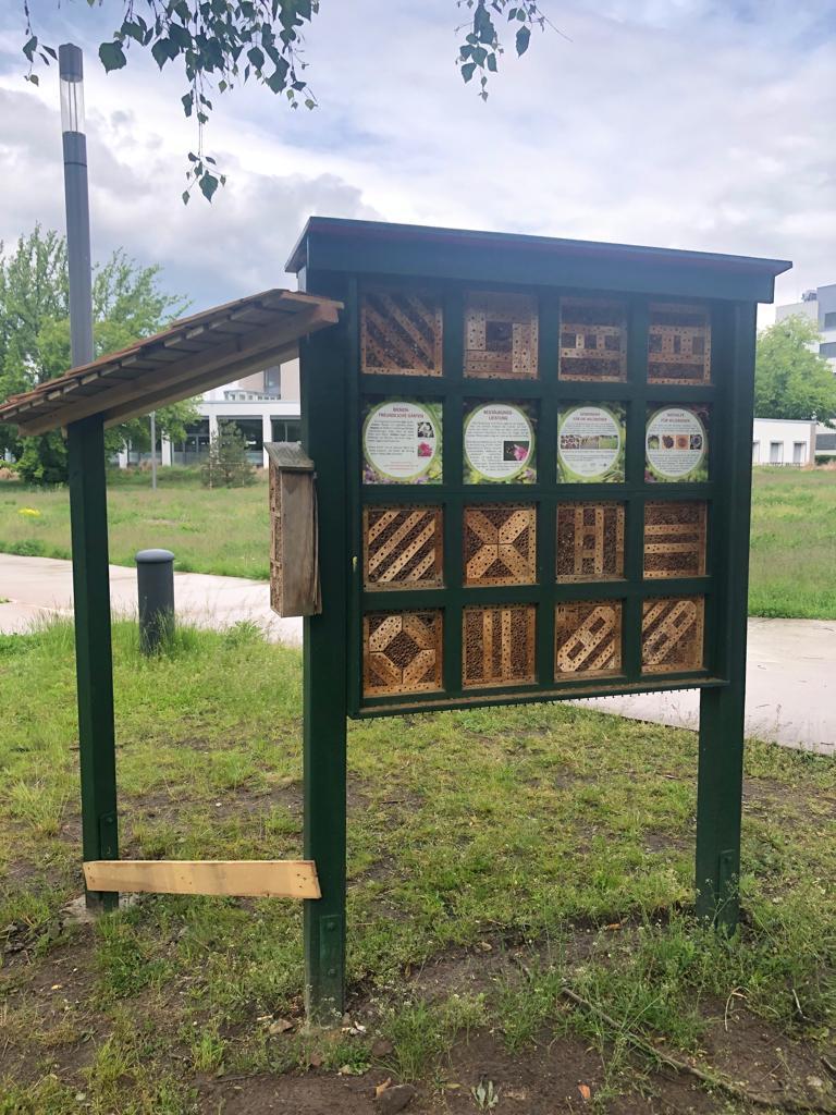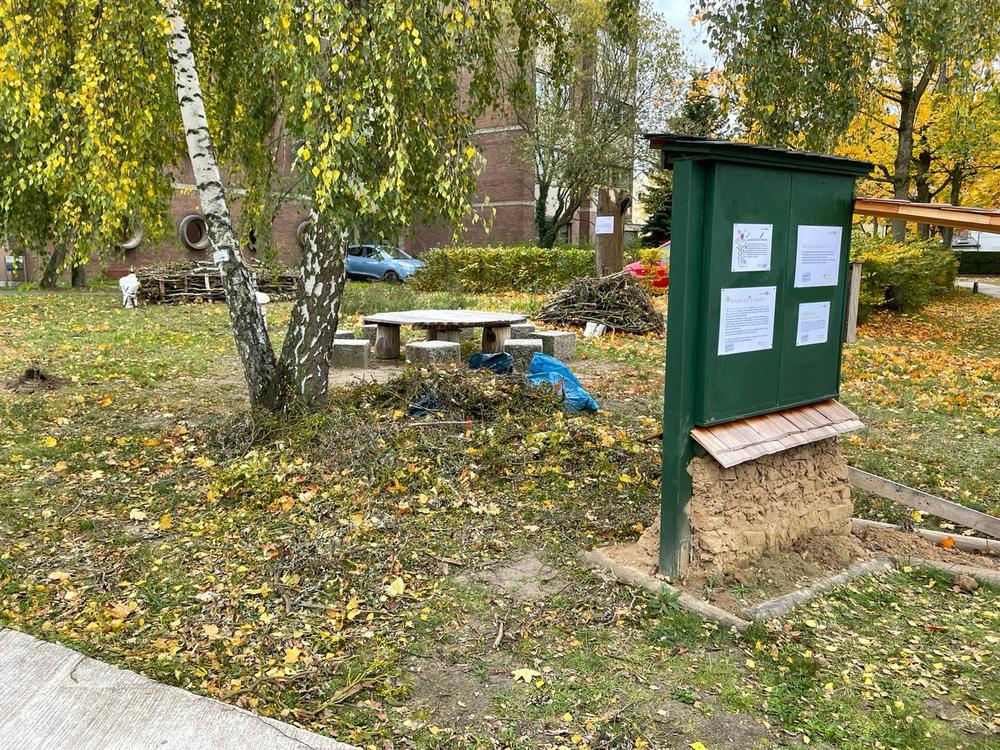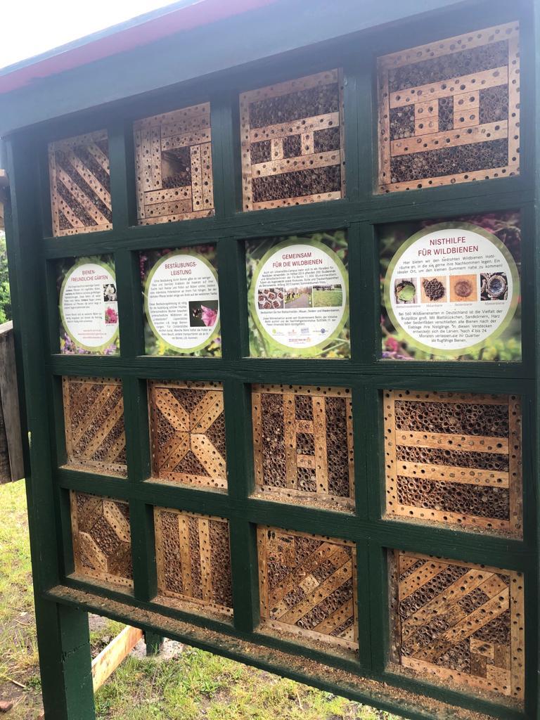 Mit Nisthilfen aus Schilfröhrchen, Totholz und einer Lehmwand für Wildbienen, einer Benjeshecke aus Totholz, einem wilden Blühstreifen, einem alten Baumstumpf sowie kleineren Reisig- und Totholzecken zeigen wir ganz praktisch, wie auf kleinster Fläche Lebens-, Brut- und Nahrungsräume für verschiedene Insekten, Vögel, Igel und andere Tiere geschaffen werden können.