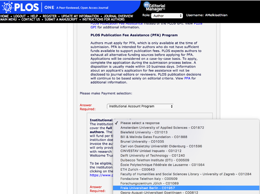 - Sie sind Mitglied der Freien Universität Berlin und reichen als Corresponding Author das Paper direkt bei der Zeitschrift ein. Die Zeitschrift muss in der Vereinbarung enthalten sein.
